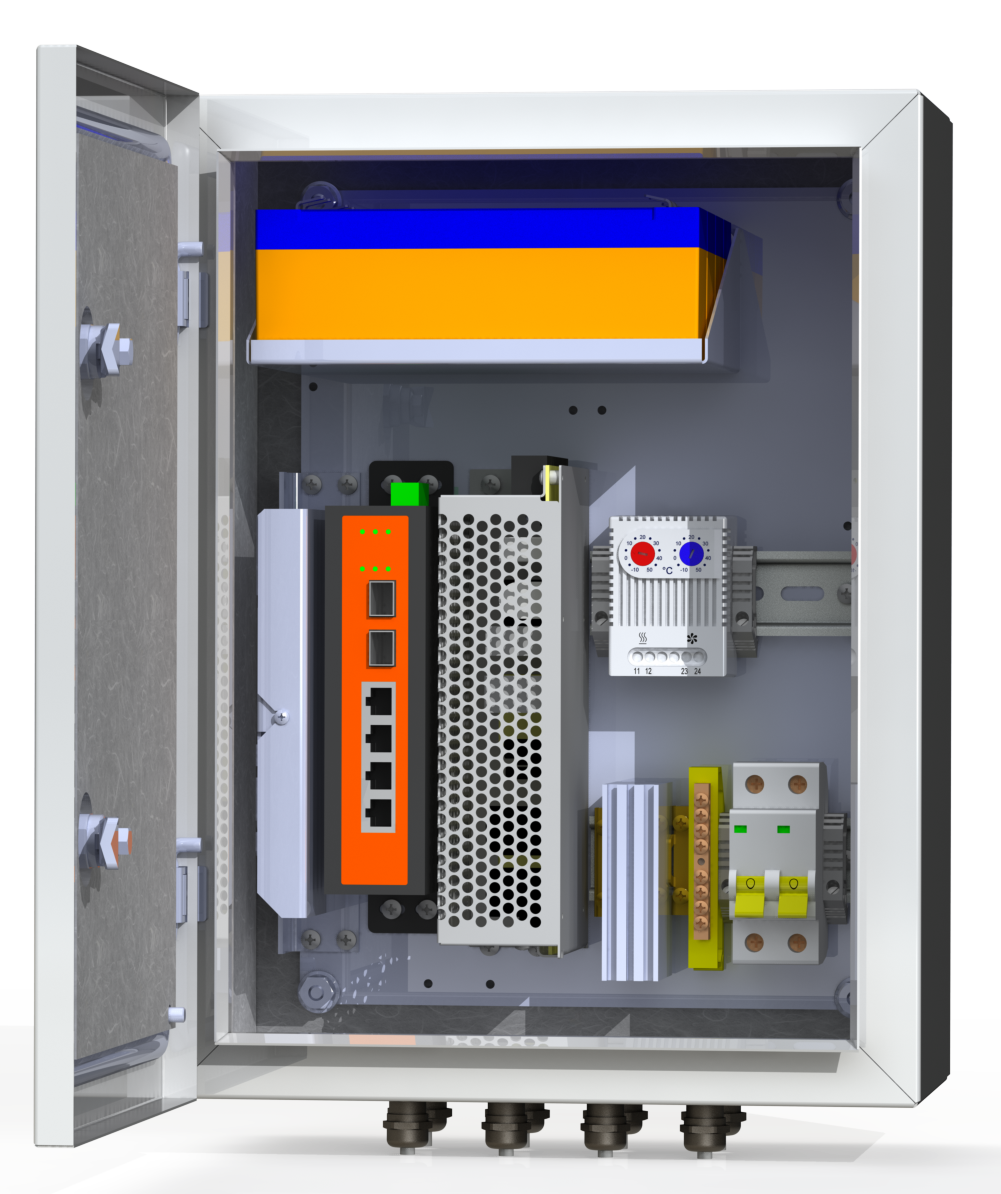 Двухполюсный защитный автомат 6А - 1 шт. Обогреватель 50Вт - 1 шт. Сдвоенный термостат - 1 шт. Блок бесперебойного питания 155Вт -1 шт. Аккумулятор 12В, 2,2А/ч - 4 шт. Промышленный неуправляемый коммутатор 4*PoE 802.3 af/at (бюджет 140 Вт), 2*SFP - 1 шт. Оптический кросс 4 порта SC/SM - 1 шт. Гермовводы 4*PG9, 4*PG13,5 -1 комплект. Устройство грозозащиты линии 220В -1 шт.