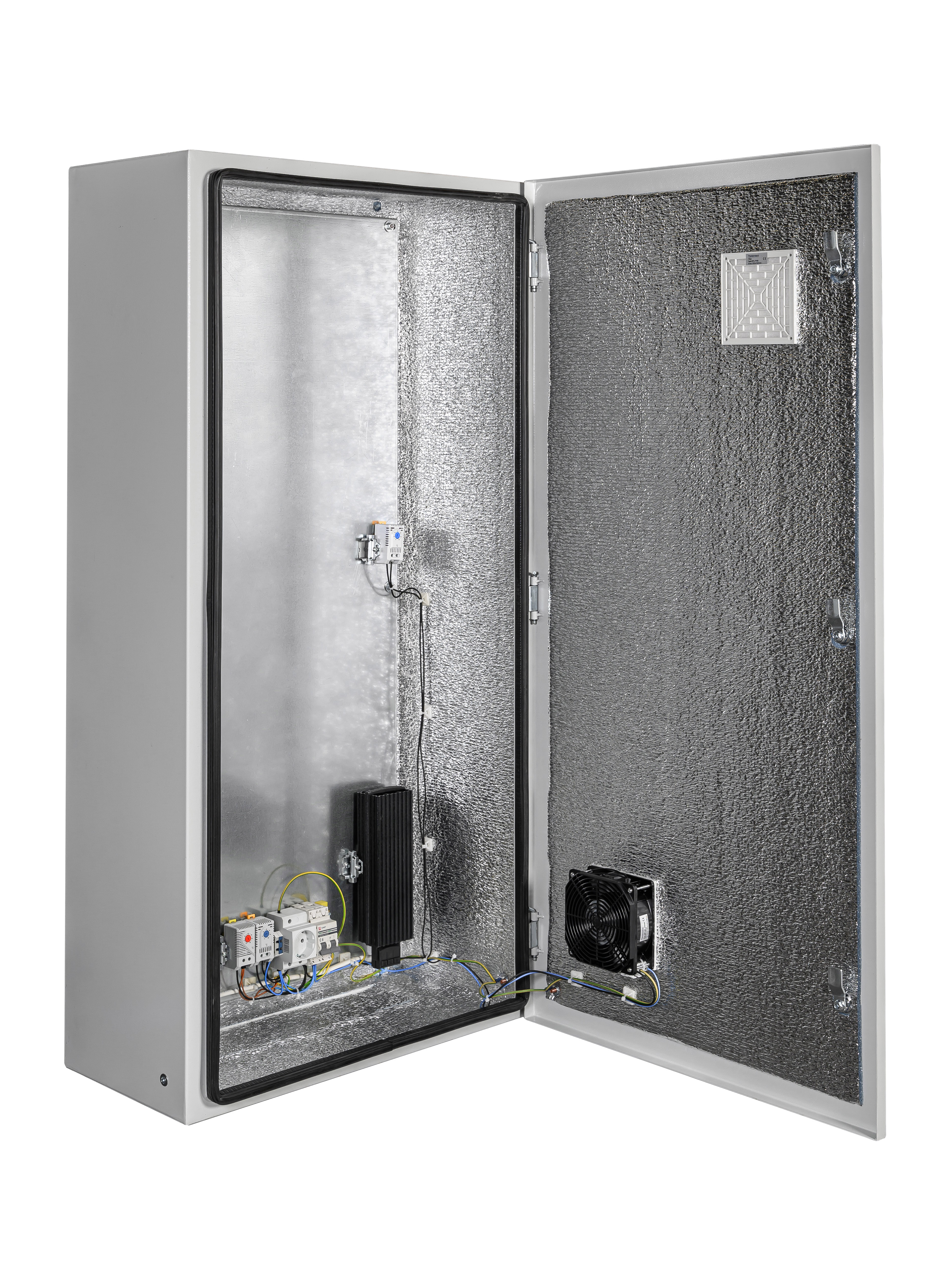 утеплитель из порилекса, замок 2 шт, ключ 1 шт, монтажная плата 1шт, гермовводы 5 шт (MG-25), розетка 1 шт, автоматический выключатель, 6А 1шт, клемма для подключения оборудования 2 шт, клемма заземления 1 шт, термореле 1шт, реле предстарта 1 шт, вентиляционная решётка с фильтром 1 шт, вентилятор с решёткой и фильтром 1 шт, нагреватель мощностью 150 Вт 2 шт.