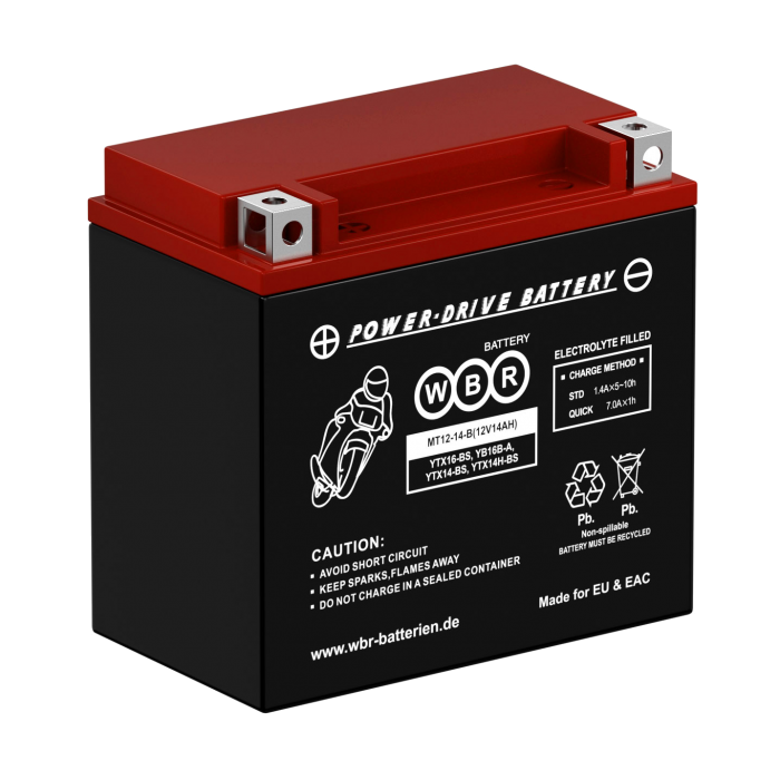 Герметизированные, выполненные по технологии AGM, необслуживаемые (MF) стартерные мотоциклетные свинцово-кислотные аккумуляторные батареи WBR серии МТ12-14-B обладают высоким качеством и надежностью. Они предназначены для запуска двигателя мотоциклов, скутеров, гидроциклов, квадроциклов, снегоходов и мотовездеходов. Батареи соответствуют техническим характеристикам и являются аналогом мотоциклетных аккумуляторных батарей YUASA модели YTX14L-BS.