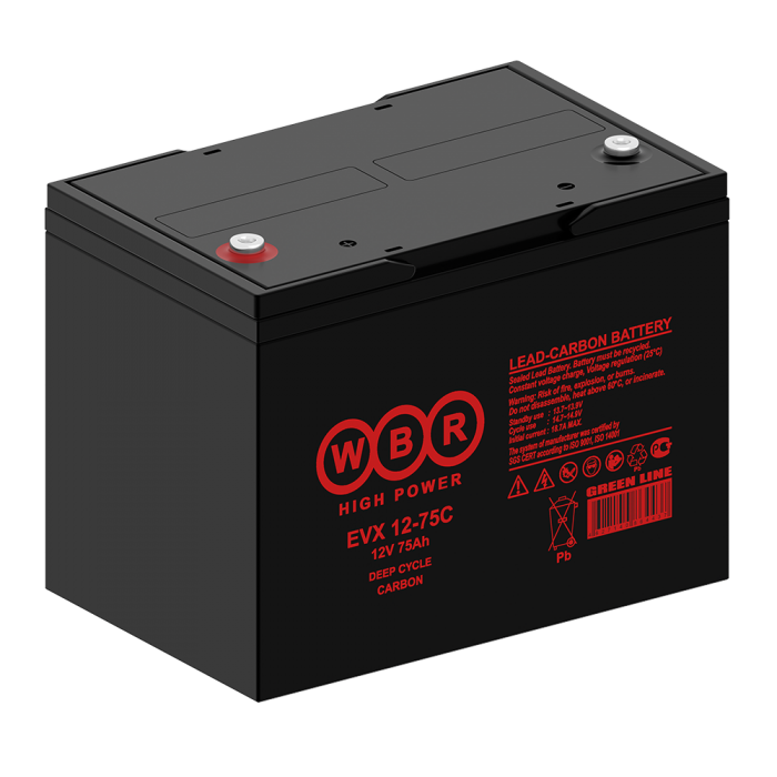 Аккумулятор WBR EVX12-75C - герметизированная, выполненная по технологии AGM, карбоновая свинцово-кислотная аккумуляторная батарея. Обладает высоким качеством и надежностью, устойчивы к глубоким разрядам и применяются для питания электрических транспортных средств, гольфкаров, газонокосилок, полотерных и поломоечных машин, медицинских колясок и другой техники.