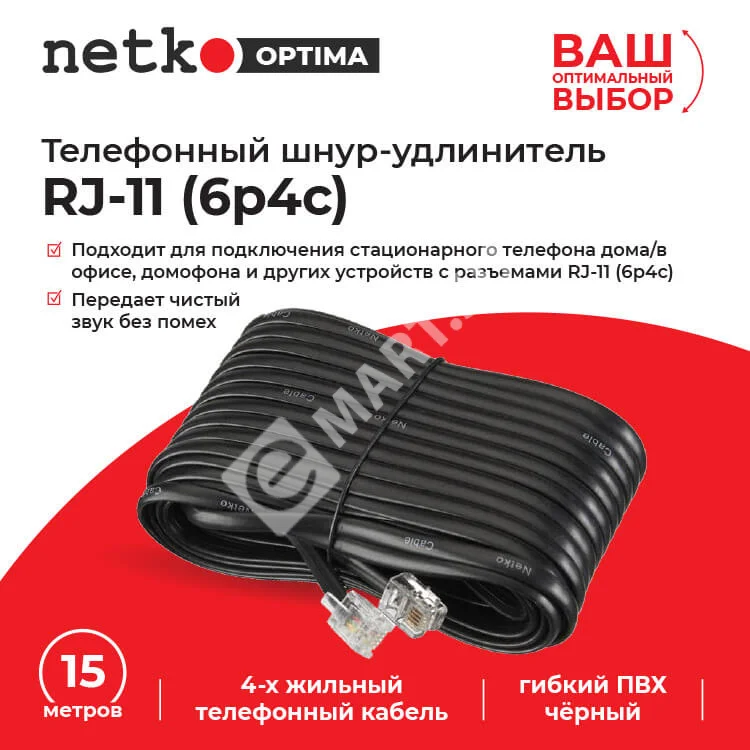 Netko Удлинитель телефонный (6р4с) 15 метров / черный Optima